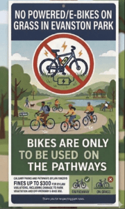 Quick reminder for everyone enjoying the park: powered bikes and e‑bikes belong on the pathways, not the grass.
